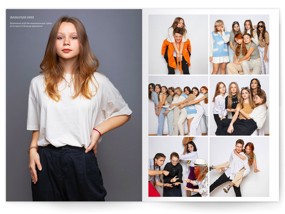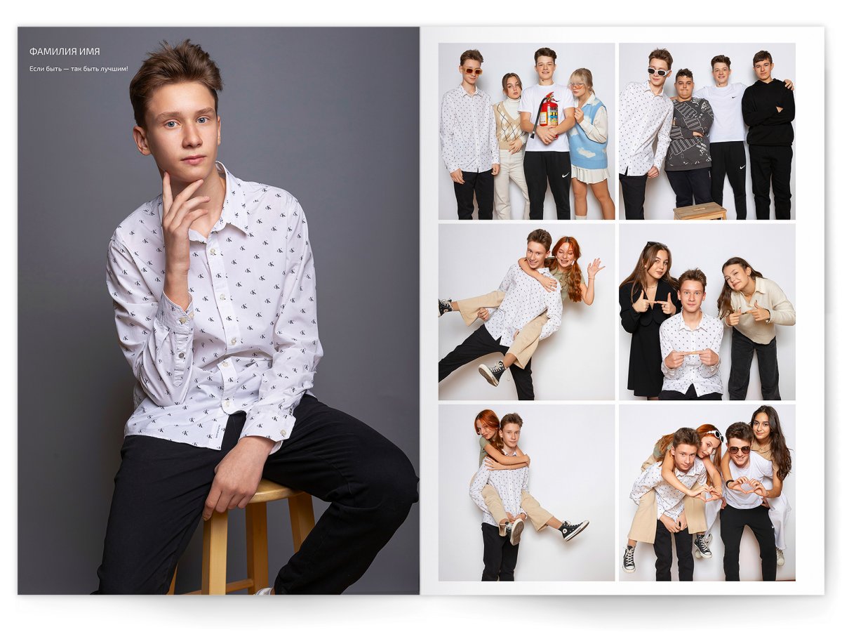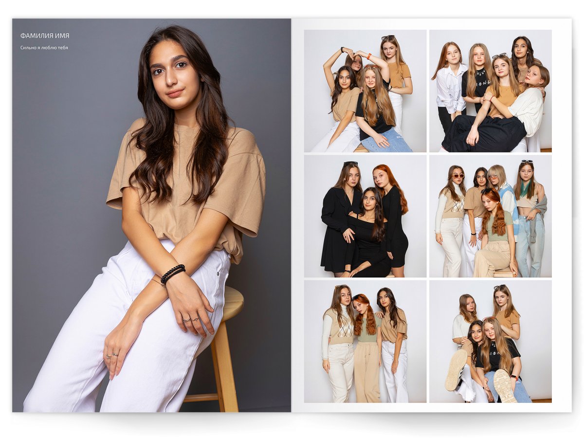 - Разворот с твоим портретом на всю страницу и от 2 до 4 фото на выбор