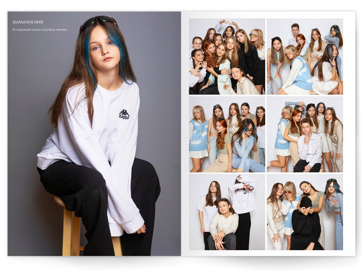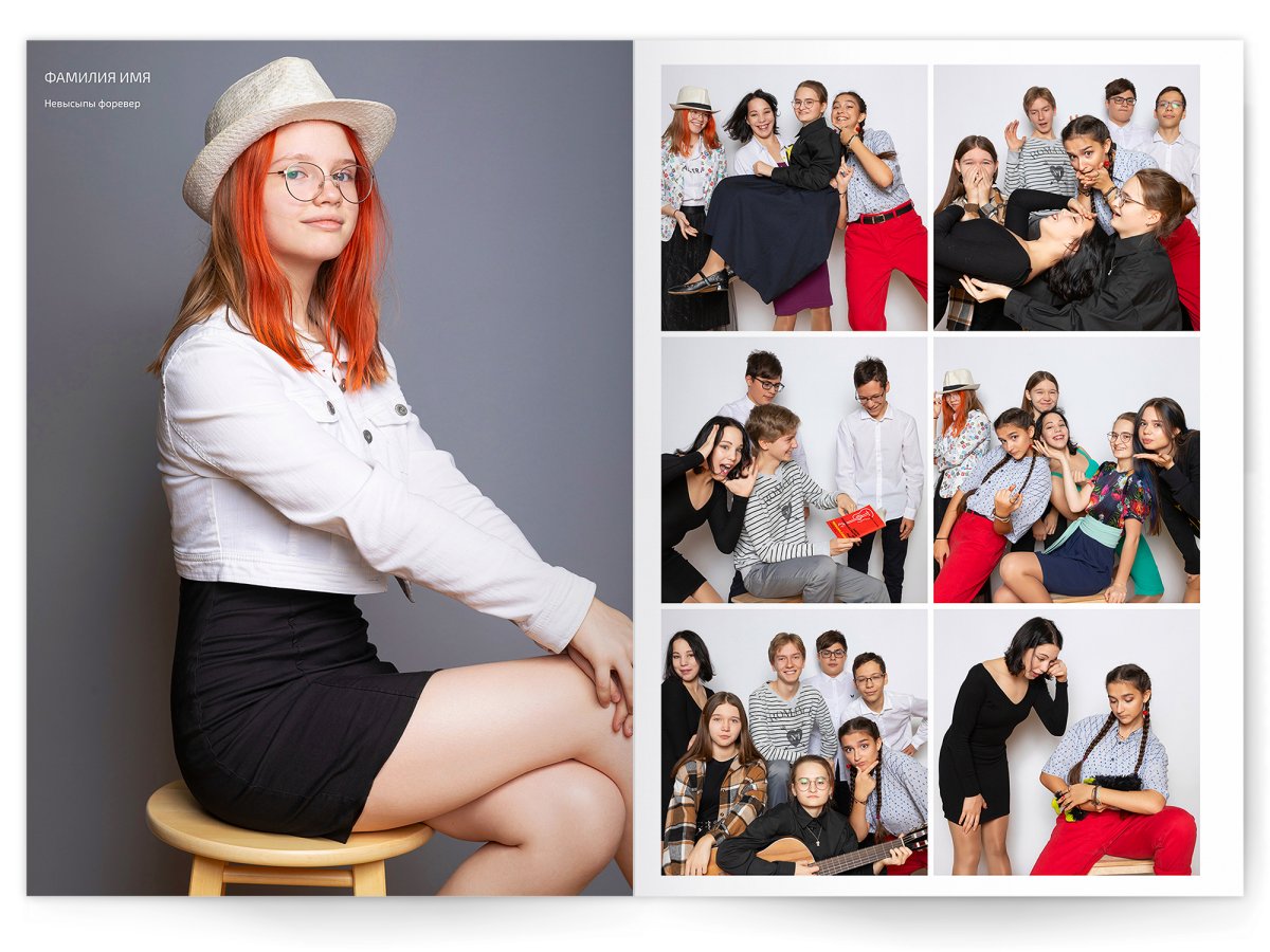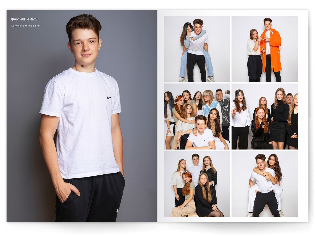 - Разворот с твоим портретом на всю страницу и от 2 до 4 фото на выбор