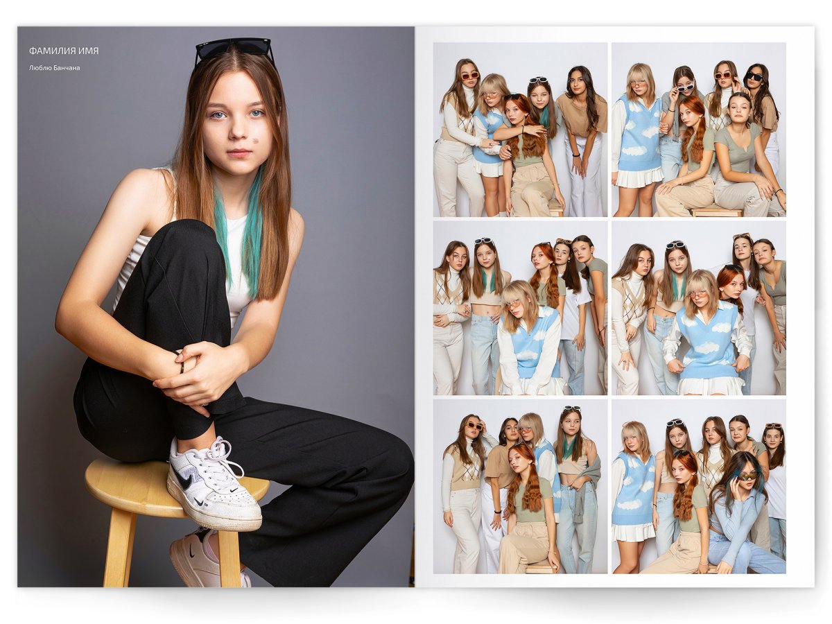- 1 большой портрет на страницу и от 2 до 4 фото на выбор
